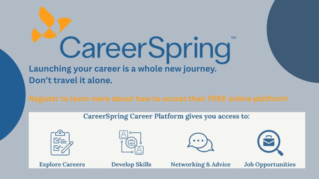 - In order to use Career Spring you will need to set up an account and attend a training (you will get a workshop credit for your attendance at the training). In the training you will set up your own Career Spring account and learn how to use the platform throughout the year to maximize the tools they offer.
